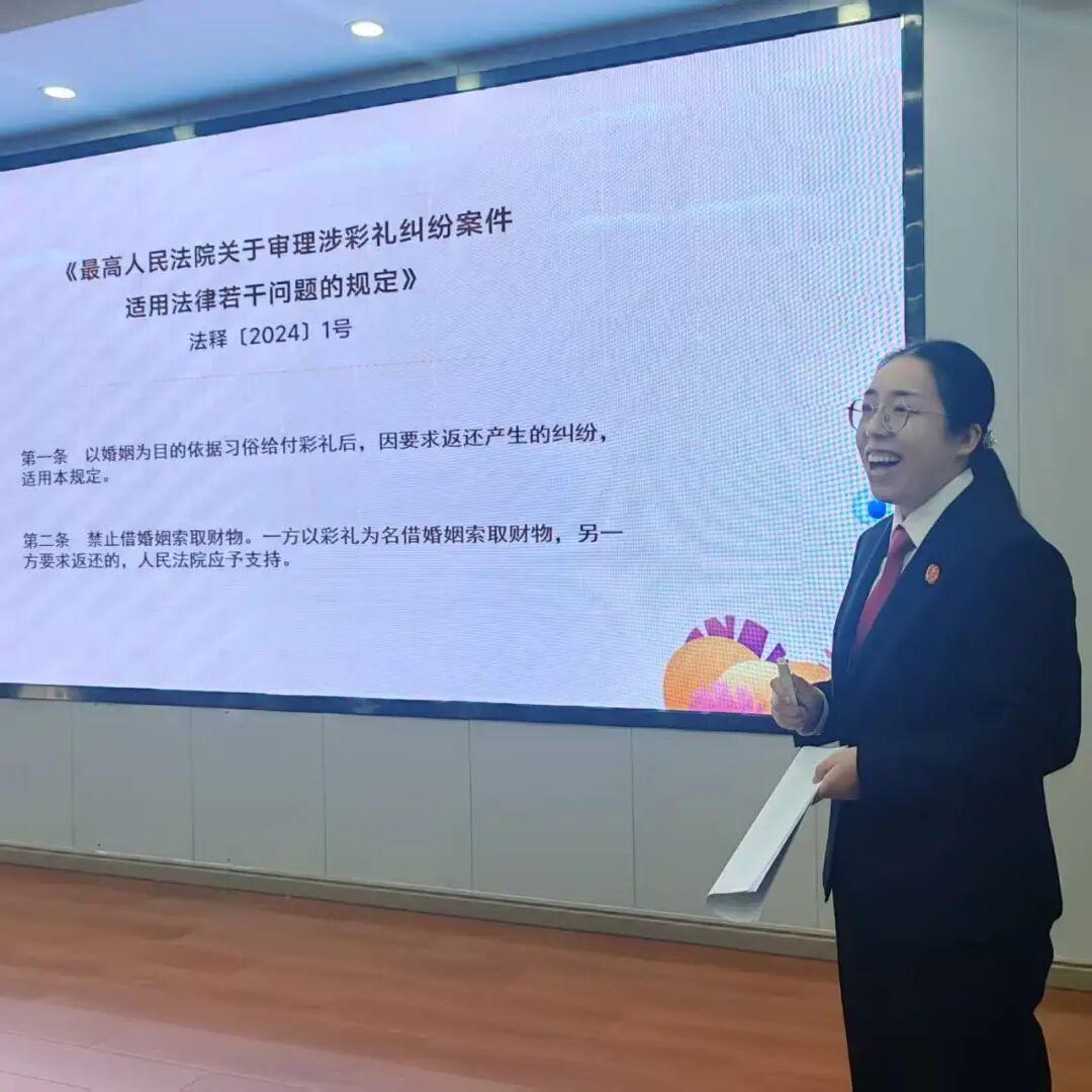 活動現(xiàn)場,干警聚焦兩大主題,以通俗易懂的方式開展宣講。在“弘揚(yáng)婚嫁新風(fēng)”環(huán)節(jié),法官以《最高人民法院關(guān)于審理涉彩禮糾紛案件適用法律若干問題的規(guī)定》為背景,結(jié)合三個(gè)典型案例,深入淺出地講解了群眾關(guān)心的彩禮問題,著力宣傳民法典關(guān)于“禁止借婚姻索取財(cái)物”的規(guī)定,引導(dǎo)村民樹立正確的婚戀觀,共同倡導(dǎo)文明鄉(xiāng)風(fēng)建設(shè)。
