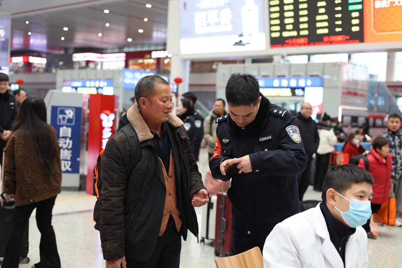 “注意腳下,請往這邊走?!薄澳?,您的檢票口在前面右轉?!薄拔襾韼湍嵝欣畎桑 痹谫F陽北站候車室內(nèi),戴著紅袖套的志愿者民警們?yōu)槁每吞峁┳稍冎敢徇\行李、電子取票等溫馨服務,用這一抹紅色點綴春運,用實際行動溫暖寒冬。