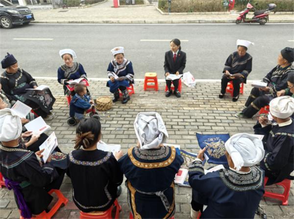 “重婚有違民法典,包辦買賣不對路,朝三暮四不可取,養(yǎng)老育兒是義務(wù)?!崩C娘們創(chuàng)作的普法水歌生動有趣。在雪花湖社區(qū)“繡娘之家”,繡娘們坐在板凳上一邊刺繡一邊興致勃勃地唱著。韋應(yīng)麗介紹說:“在水鄉(xiāng),群眾愛唱歌但識字不多,學(xué)習法律有困難。所以我們的繡娘不僅要成為矛盾糾紛調(diào)解的行家,更要成為合格的普法員。”繡娘們將國家法律法規(guī)和政策編排成“調(diào)解歌”“新時代女性歌”“孝老愛親歌”“禁毒防邪歌”等少數(shù)民族山歌,唱給群眾聽,讓大家一聽就懂,多聽還能跟著哼唱,對法律知識更感興趣,真正做到聽得懂、記得住、用得上。