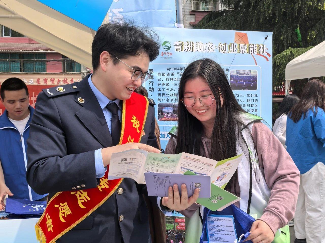 在活動(dòng)現(xiàn)場(chǎng),稅法宣傳志愿者穿梭于“青聽心聲·鄰里會(huì)客廳”“青護(hù)家園·環(huán)保先鋒營”“青耕助農(nóng)·創(chuàng)業(yè)聚能社”等展示區(qū),用通俗易懂的語言為“擺攤者”“趕集者”講解個(gè)人所得稅專項(xiàng)附加扣除、重點(diǎn)群體創(chuàng)業(yè)就業(yè)稅收優(yōu)惠、社保費(fèi)繳納流程等與群眾生活、經(jīng)營息息相關(guān)的熱點(diǎn)稅收知識(shí)。此次活動(dòng)還設(shè)置了稅法咨詢臺(tái),為前來咨詢的商戶、青年提供“一對(duì)一”答疑服務(wù),并發(fā)放印有國家稅務(wù)總局微信公眾號(hào)二維碼的宣傳折頁,方便青年群體掃碼獲取更多稅收知識(shí)。
