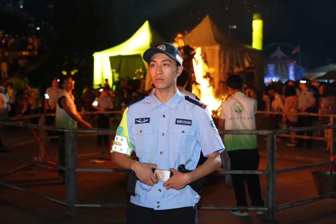 晚上10時,九堆環(huán)形篝火被同時點燃,數(shù)千支火把剎那間將夜空映照得通紅熾烈。人潮隨著彝族達(dá)體舞的奔放節(jié)奏熱情涌動、跳躍。此刻,彝族民警王偉旭正帶領(lǐng)巡邏小組在人流中穿梭,目光銳利如鷹,不放過任何一個安全死角?!绑艋鹞鑴訒r,必須保證游客處于火星噴射半徑之外,我們民警組成的這道‘隔離帶’,就是守護(hù)生命的安全線!”篝火管控組組長崔恒的話語擲地有聲。