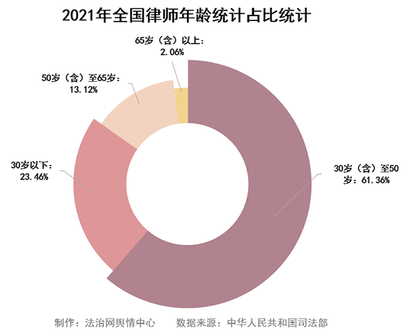 從年齡結(jié)構(gòu)來看,律師行業(yè)處于老中青共存階段。其中,30歲-50歲律師占比最高,達(dá)61.36%,30歲以下律師占比達(dá)23.46%,律師隊伍年輕化趨勢明顯。