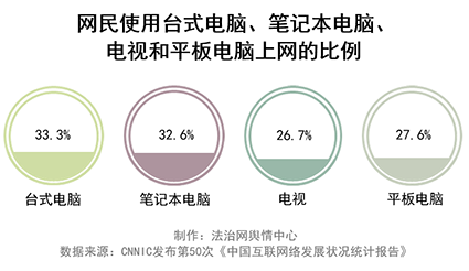 隨著智能手機普及,移動網絡速度大幅提升,網絡接入環(huán)境變得多元。據第50次《報告》顯示,我國手機網民已達到10.47億,占總體的99.6%;使用臺式電腦、筆記本電腦、電視和平板電腦上網的比例分別為33.3%、32.6%、26.7%和27.6%。