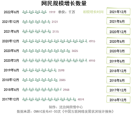 第50次《報告》顯示,2022年6月相較于2021年12月新增網民1919萬人。