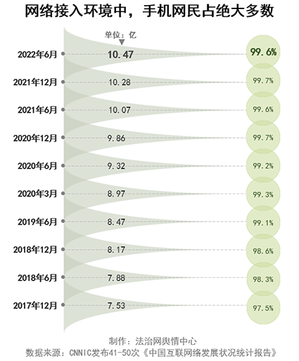 從2017年12月到2022年6月網民規(guī)模對比數(shù)據可以看出,我國網民規(guī)模持續(xù)增長。2020年12月相較于2020年6月網民增長數(shù)量更是突破了4900萬人。
