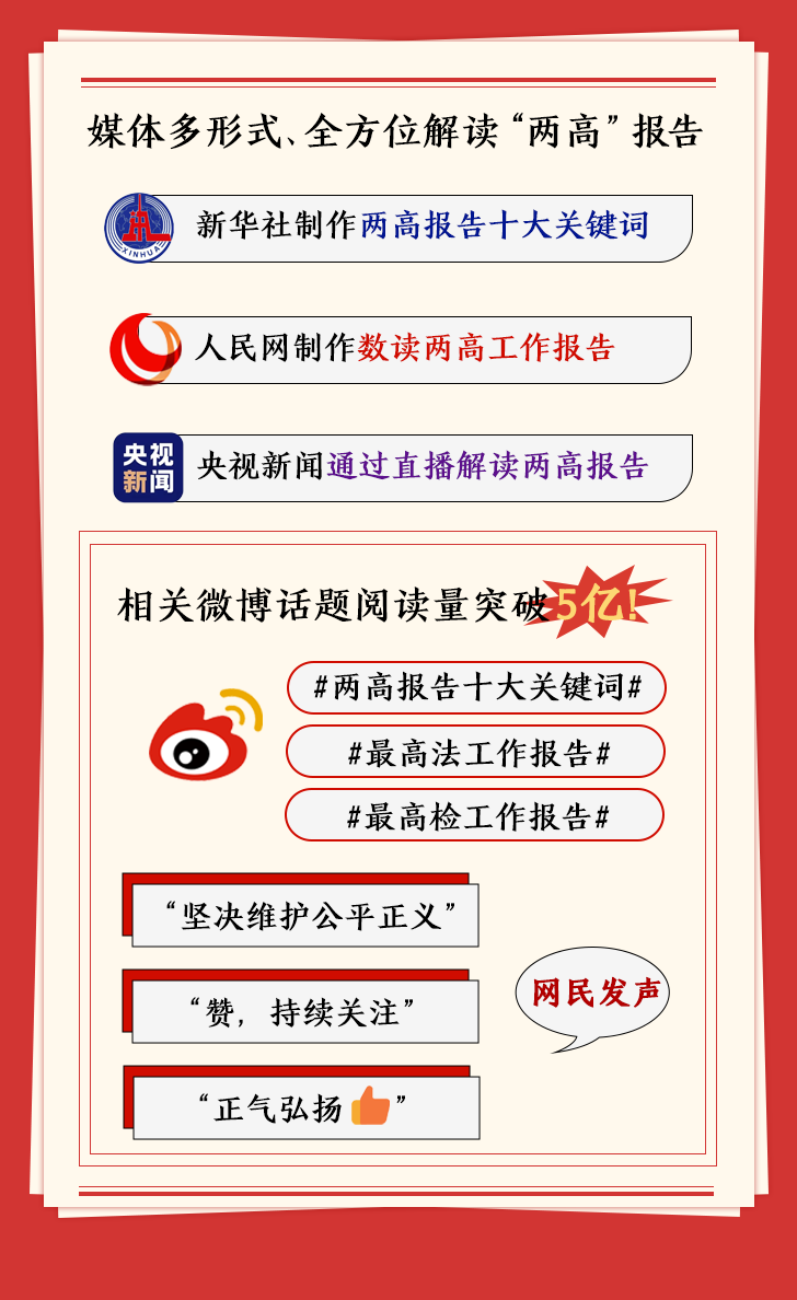新華社制作長圖整理“兩高”報告亮點內(nèi)容;人民網(wǎng)用數(shù)據(jù)解讀“兩高”報告;“@央視新聞”則通過直播幫助公眾快速了解報告詮釋的法治精神?!皟筛摺眻蟾嫦嚓P(guān)話題獲得網(wǎng)民廣泛關(guān)注,截至3月8日8時,“#兩高報告十大關(guān)鍵詞#”等微博話題閱讀量累計超5億。
