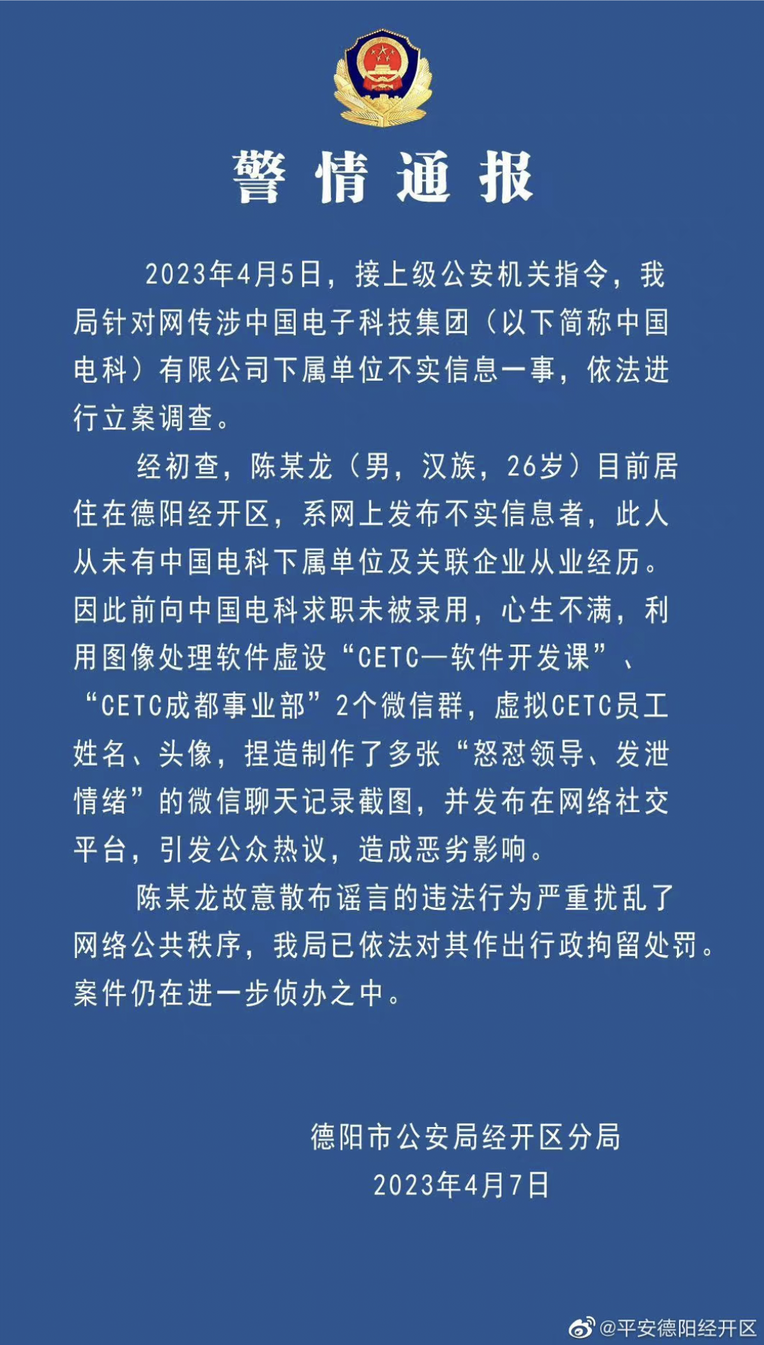 4月7日,大皖新聞報(bào)道稱,網(wǎng)傳加班事件當(dāng)事人陳志龍為四川省德陽市經(jīng)開區(qū)某科技公司員工,德陽市人社局辦公室也回應(yīng)稱“正在進(jìn)行調(diào)查”。4月7日晚間,四川省德陽市公安局經(jīng)開區(qū)分局通過官方微博發(fā)布警方通報(bào)稱,陳某龍從未有中國(guó)電科下屬單位及關(guān)聯(lián)企業(yè)從業(yè)經(jīng)歷,其因此前向中國(guó)電科求職未被錄用,心生不滿,利用圖像處理軟件虛設(shè)“CETC—軟件開發(fā)課”“CETC成都事業(yè)部”2個(gè)微信群,虛擬CETC員工姓名、頭像,捏造制作了多張“怒懟領(lǐng)導(dǎo)、發(fā)泄情緒”的微信聊天記錄截圖,并發(fā)布在網(wǎng)絡(luò)社交平臺(tái),造成惡劣影響。目前陳某龍已被警方行政拘留。4月8日,微博平臺(tái)官方表示,已清理此事件中散布不實(shí)信息、惡意攻擊國(guó)企體制的違規(guī)內(nèi)容5792條,并對(duì)“@老c隊(duì)長(zhǎng)”等9個(gè)違規(guī)“自媒體”賬號(hào)及253個(gè)違規(guī)用戶予以禁言處置。