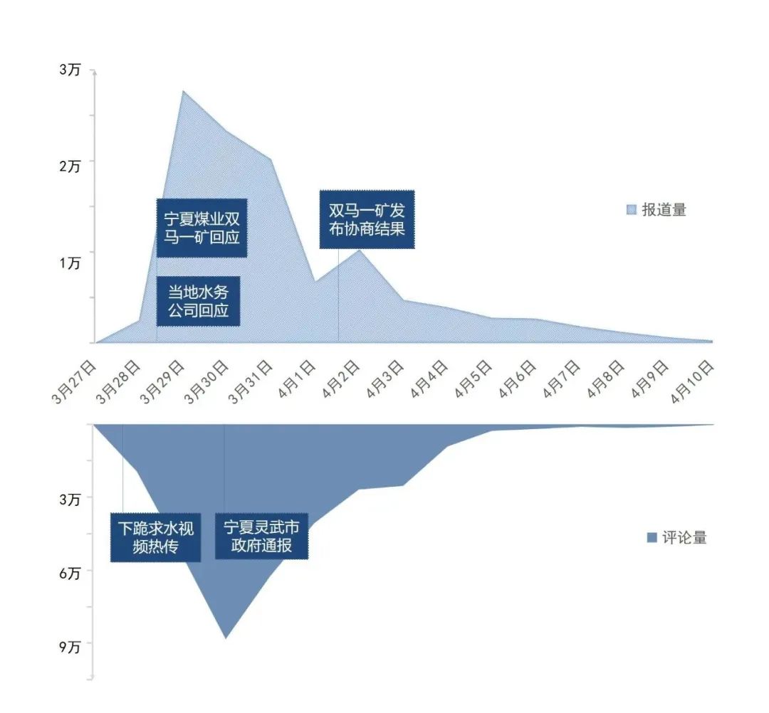 3月29日,部分中央主流媒體發(fā)聲表態(tài):“@中國新聞網(wǎng)”稱“‘缺水’的輿論場需要真相甘霖”;央廣網(wǎng)推出文章《萬畝治沙林被煤礦“斷水”?供水和調(diào)查必須馬上到位》,指出當(dāng)?shù)乇仨毐M快用客觀公正的調(diào)查還原真相,給林場主一個(gè)交代,給萬畝林場一個(gè)交代,也給公眾一個(gè)交代。輿論場還曝光一份判決書,顯示寧夏回族自治區(qū)銀川市中院曾作出判決,明確該煤礦占用林地,要求賠償孫國友727.54萬元。另據(jù)九派新聞報(bào)道,當(dāng)?shù)厮畡?wù)公司負(fù)責(zé)人稱,礦場污水處理達(dá)標(biāo),但是水的鹽分過高澆不了樹。煤礦一方稱,污水處理設(shè)備容量比較小,每天只能處理兩千立方,且資金成本太大,不想加大投入。靈武市政府相關(guān)人員向媒體表示,正在針對(duì)此事協(xié)調(diào)處理。當(dāng)日,“#萬畝樹木被煤礦斷水面臨枯死#”“#水務(wù)公司回應(yīng)萬畝林場主跪地求供水#”等相關(guān)微博話題沖上熱搜榜前列,輿情熱度達(dá)到峰值。部分網(wǎng)民表示,經(jīng)歷了沙塵暴,才能真正明白造林治沙的好處和難處,“不能讓好人流汗流淚又流血”。微博大V“@胡錫進(jìn)”也呼吁,希望不用下跪崩潰引起巨大輿情也能正常解決。