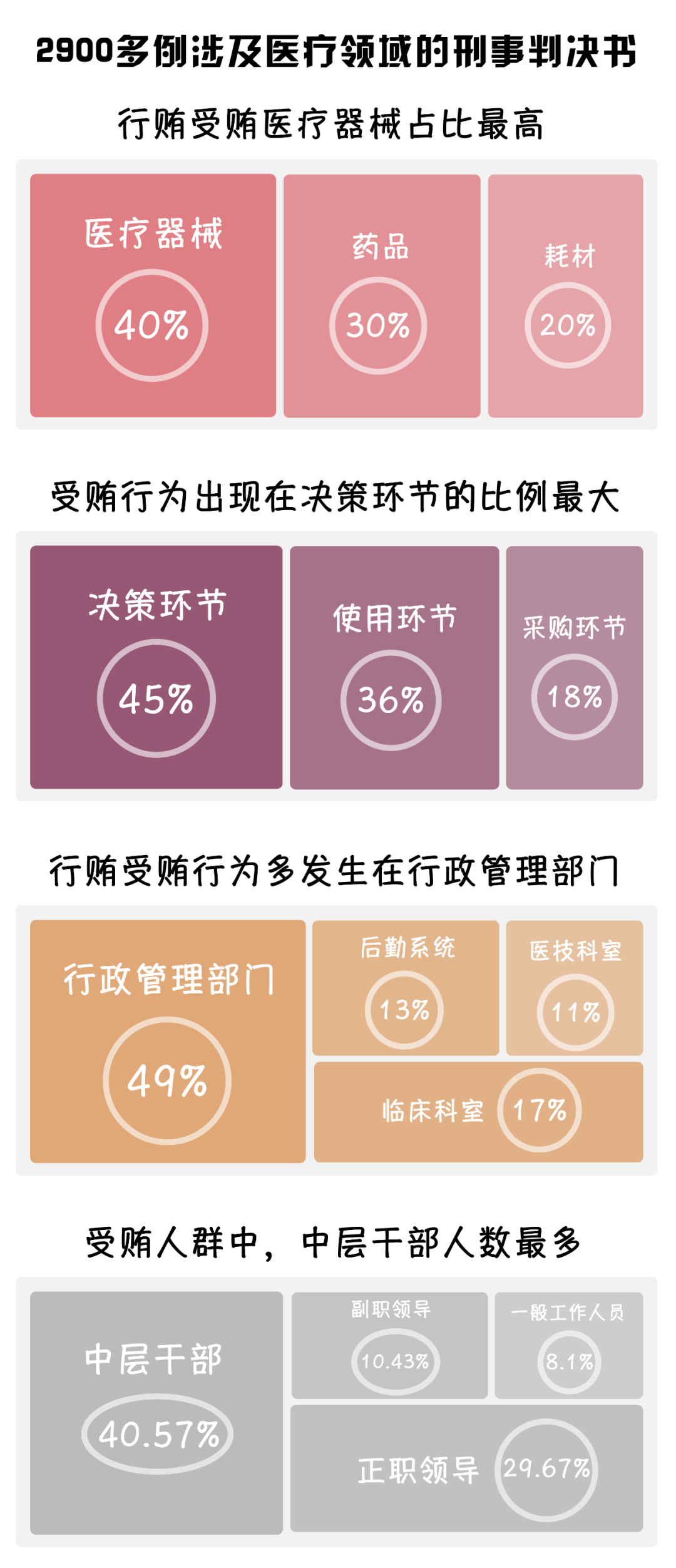 中國(guó)新聞網(wǎng)發(fā)布了一篇名為《2900多份醫(yī)療腐敗刑事判決書(shū)背后》的文章,其中梳理了2013-2021年間2900多例涉及醫(yī)療領(lǐng)域的刑事判決書(shū),提到了如下關(guān)鍵點(diǎn):