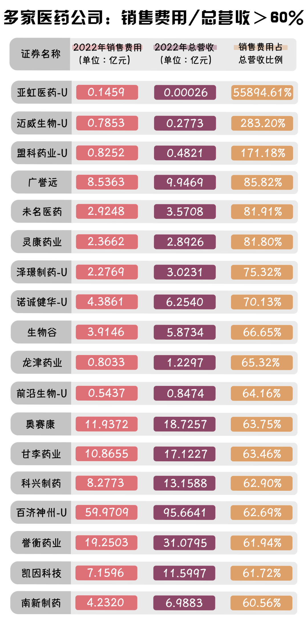 2.多家藥企銷(xiāo)售費(fèi)用占總營(yíng)收的比例超過(guò)60%