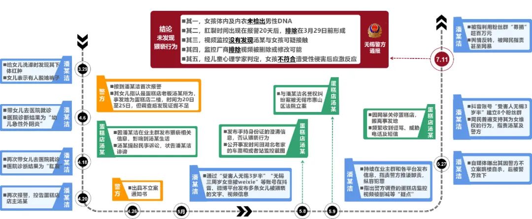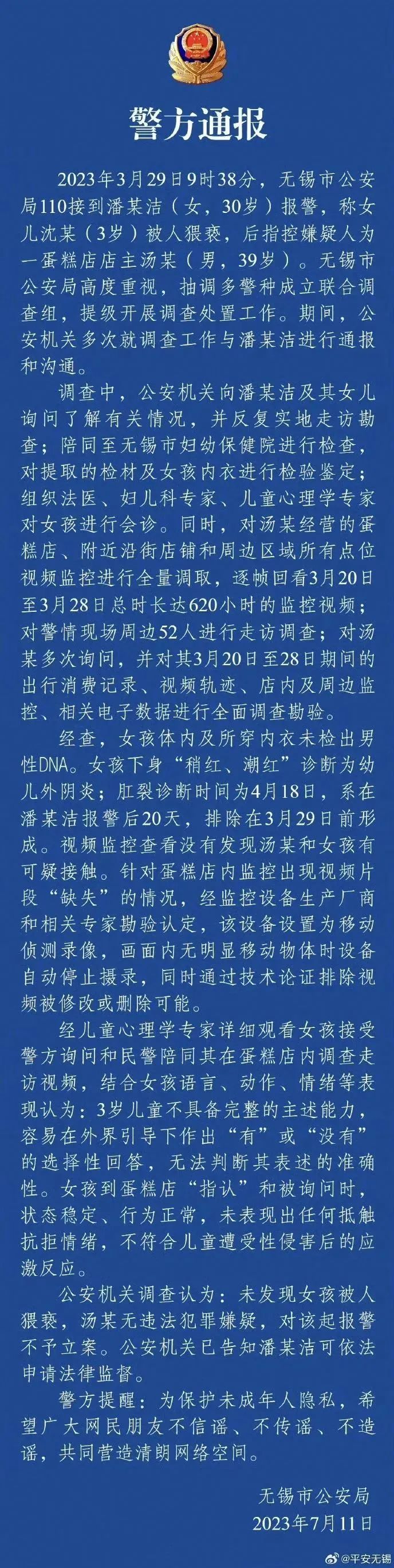 面對(duì)巨大的輿情壓力,7月11日,無(wú)錫市公安局發(fā)布通報(bào),詳述調(diào)查過(guò)程,包括DNA檢測(cè)、肛裂原因排除、視頻監(jiān)控核查、心理學(xué)家判定等內(nèi)容。通報(bào)全文800余字,邏輯清晰、內(nèi)容詳實(shí),“不存在猥褻行為”這一結(jié)論獲得輿論認(rèn)可,“#警方通報(bào)無(wú)錫3歲女童事件調(diào)查結(jié)果#”等微博話題閱讀量累計(jì)近6億。至此,輿情反轉(zhuǎn),多數(shù)網(wǎng)民指責(zé)潘某潔虛構(gòu)事實(shí)、利用女兒造謠污蔑,呼吁依法對(duì)其嚴(yán)懲。