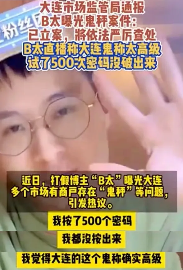 11月9日,“B太”發(fā)布實(shí)測海鮮加工餐廳的視頻,稱其到訪的3家海鮮加工商家均疑似在秤上做了手腳。“B太”嘗試破解商家使用的“鬼秤”密碼時(shí),被商家推搡,還遭威脅“把眼鏡給你砸了”;其撥打市場監(jiān)管局電話后,等待一個(gè)半小時(shí)仍無人到場,直到“B太”開啟直播,工作人員才姍姍來遲?!癇太”出示相關(guān)視頻證據(jù),經(jīng)檢查該商家的電子秤雖然有強(qiáng)檢合格證,但沒有鉛封。而當(dāng)“鬼秤”被帶到市場監(jiān)管局時(shí),專業(yè)檢測人員只對“問題電子秤”進(jìn)行簡單檢測后就宣布該秤“無問題”。當(dāng)“B太”提出對電子秤進(jìn)行密碼破譯時(shí),檢測人員表示“我也跟著學(xué)習(xí)學(xué)習(xí)”,但“B太”嘗試了500多個(gè)密碼都未破解成功。次日,該電子秤被送往無錫檢測。“B太”在微博和抖音平臺發(fā)布相關(guān)視頻,播放量迅速破億次,多數(shù)網(wǎng)民指責(zé)店家有恃無恐,質(zhì)疑市場監(jiān)管部門消極怠工;部分計(jì)劃去大連旅游的網(wǎng)民還表示,因擔(dān)心被“坑”將臨時(shí)改變目的地。