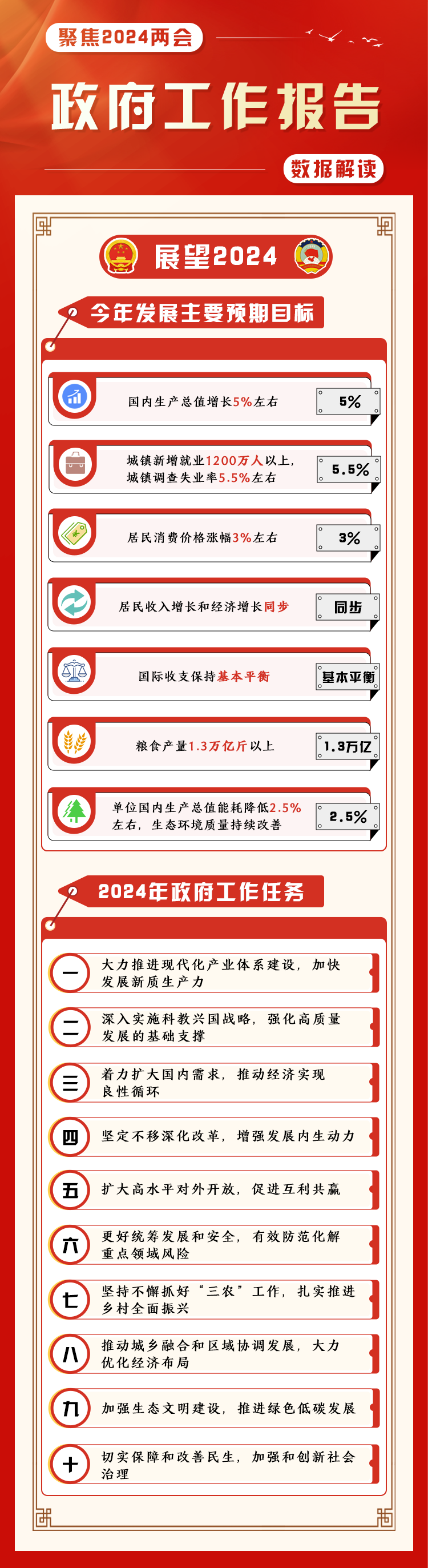(制作:法治網(wǎng)輿情中心 數(shù)據(jù)來源:新華社微博:《一圖速覽2024年政府工作報告》;中國新聞網(wǎng):《事關(guān)你我!30句話讀懂政府工作報告》)