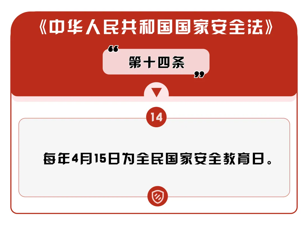 2015年7月1日,全國人大常委會通過的《中華人民共和國國家安全法》第十四條規(guī)定,每年4月15日為全民國家安全教育日。