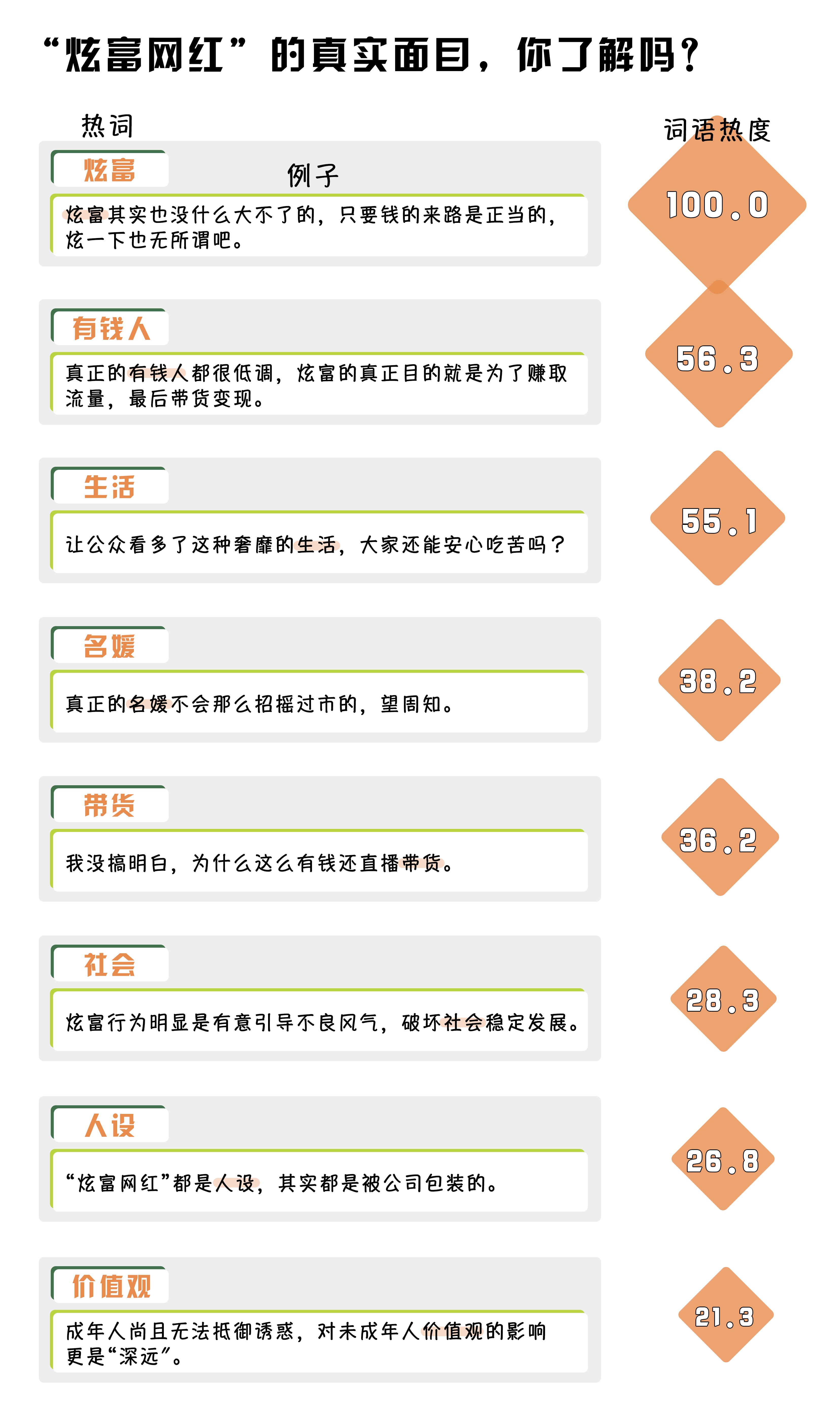 (制作:法治網(wǎng)輿情中心 數(shù)據(jù)來(lái)源:在嗶哩嗶哩選取《炫富網(wǎng)紅圈“地震”:多名百萬(wàn)級(jí)網(wǎng)紅被全平臺(tái)封禁》《“京城第一名媛”被全網(wǎng)封殺》等兩則視頻的彈幕、一級(jí)評(píng)論,進(jìn)行數(shù)據(jù)清洗及自然語(yǔ)言處理,將熱度最高的詞語(yǔ)規(guī)定為100)