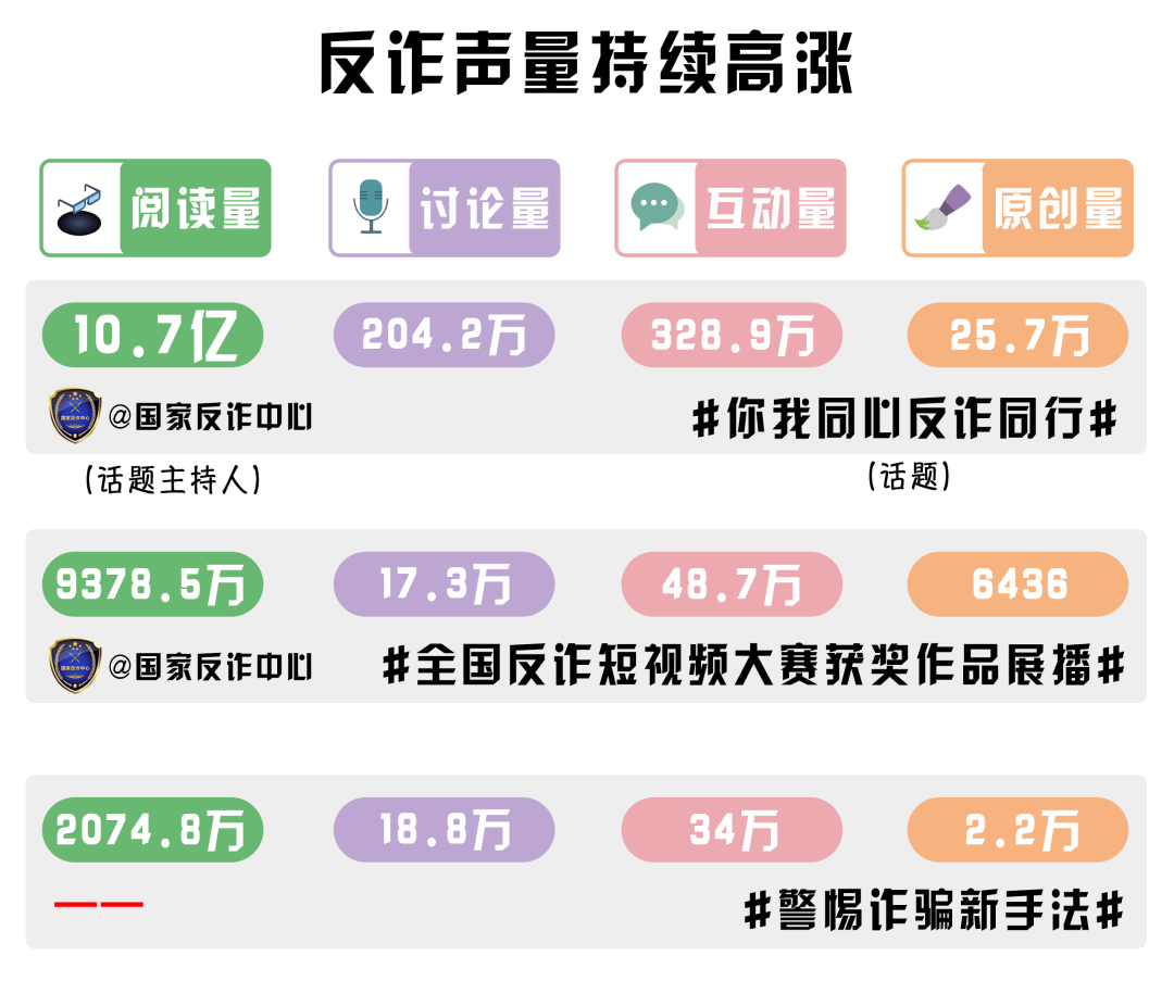 從微博數(shù)據(jù)來(lái)看,#你我同心反詐同行# #全國(guó)反詐短視頻大賽獲獎(jiǎng)作品展播# #警惕詐騙新手法#等微博話題累計(jì)閱讀量超11.8億,輿論反響熱烈,反詐聲量持續(xù)高漲。