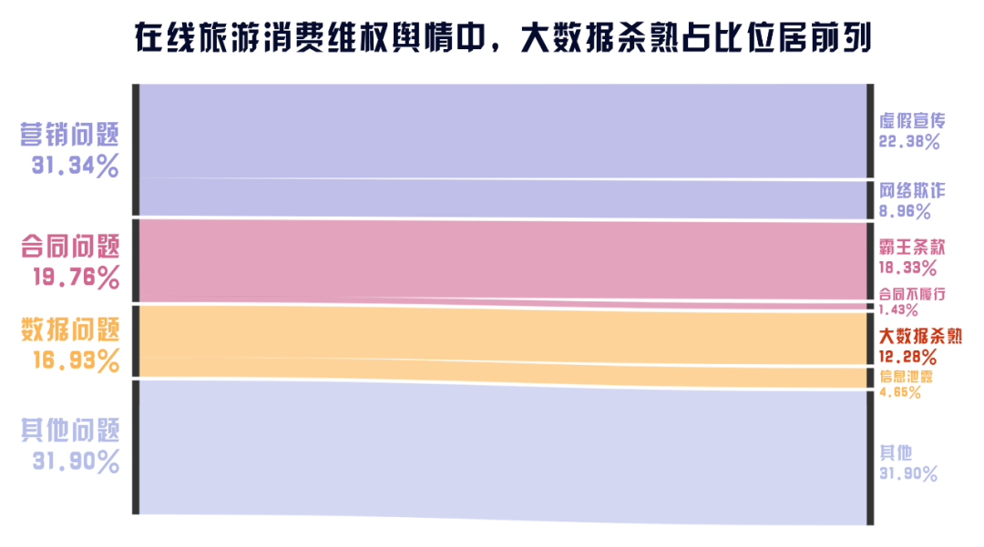在超過10%在線旅游消費輿情問題比例的4個方面中,大數(shù)據(jù)殺熟(12.28%)赫然在列,其存在于傳統(tǒng)平臺的同時,也向新型平臺“延伸”。