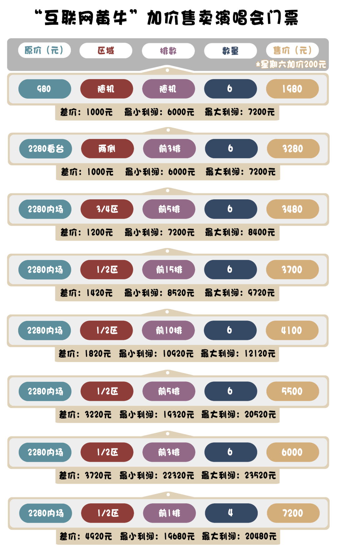 盡管如此,對(duì)于背后有二級(jí)資源的“互聯(lián)網(wǎng)黃牛”來說,售賣“黃牛”票并不是難事。以某位在廣東地區(qū)深受歡迎的歌手為例,其預(yù)計(jì)在今年11月舉行多場(chǎng)個(gè)人演唱會(huì),但有粉絲表示,演唱會(huì)的門票仍“一秒售罄”。某二手置物平臺(tái)數(shù)據(jù)顯示,演唱會(huì)門票并非全部售空,部分門票流入“互聯(lián)網(wǎng)黃?!敝?,原價(jià)為2280元的內(nèi)場(chǎng)票,因位置不同被炒至3280元至7200元不等。此外,若趕上演唱會(huì)在星期六舉辦,買家還需要額外支付200元的“熱門時(shí)段搶票費(fèi)用”。面對(duì)“一人一證”的入場(chǎng)機(jī)制,“互聯(lián)網(wǎng)黃牛”的生意似乎并未受到影響。