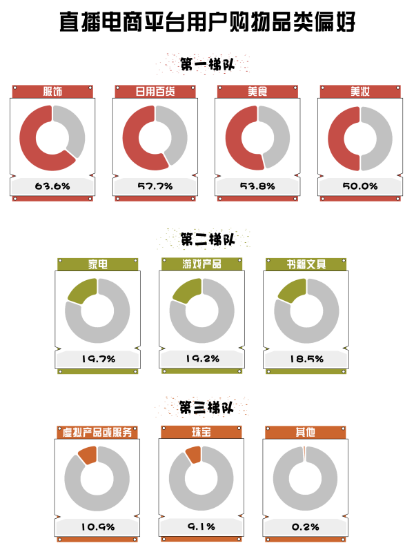 根據(jù)微播易、蟬媽媽等聯(lián)合發(fā)布的《2023年中國直播電商機會洞察報告》顯示,直播電商平臺用戶購物品類偏好中,美食位列第一梯隊,占比達到53.8%,反映了公眾對食品消費從吃得飽到吃得好的轉(zhuǎn)變。