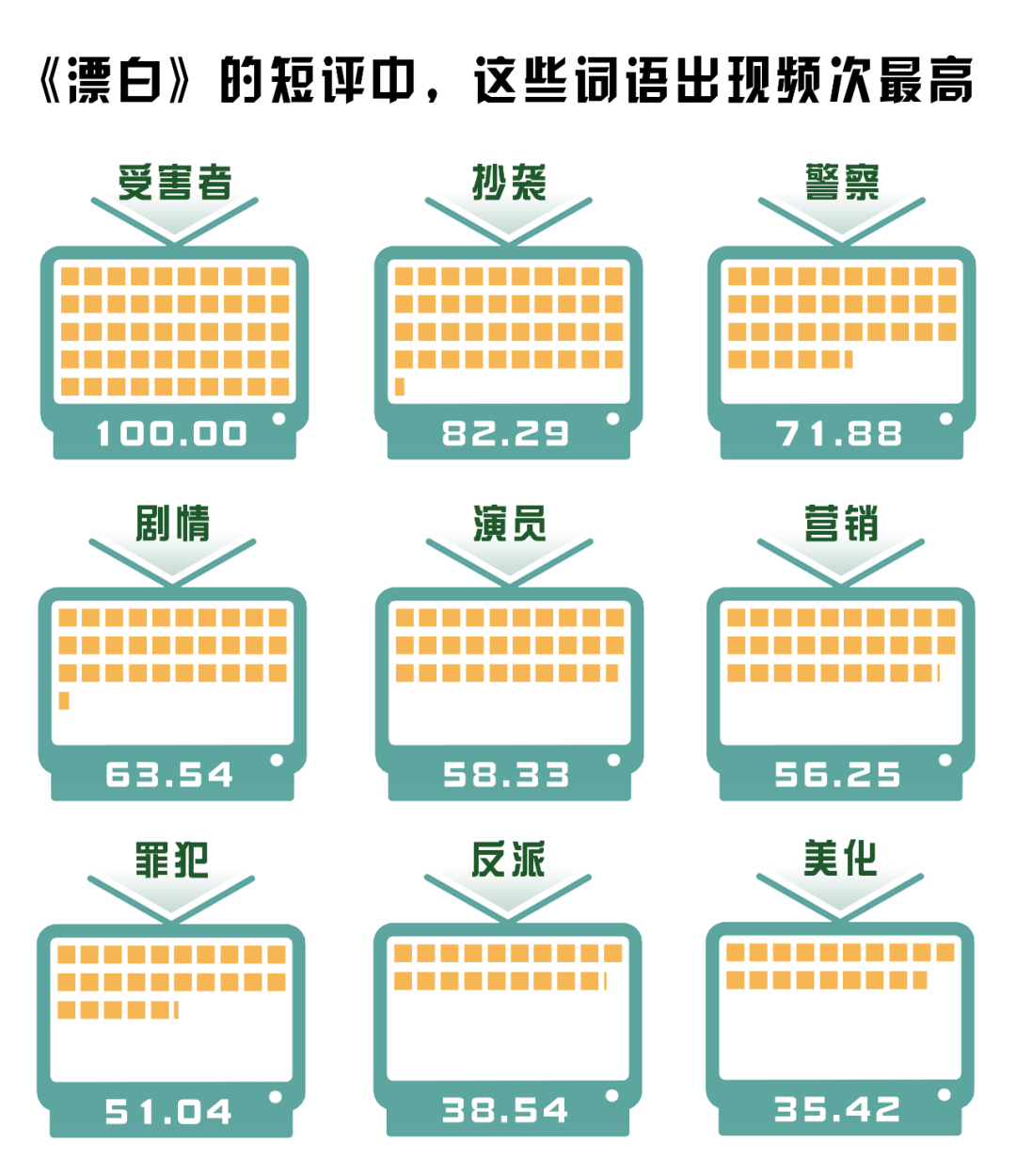 (制作:法治網輿情中心 數(shù)據來源:選取400條《漂白》豆瓣短評,對短評做分詞及歸一化處理,進行分詞后將熱度最高的詞語規(guī)定為100)