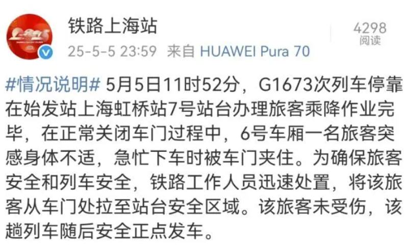 5月5日,網(wǎng)傳上海虹橋高鐵站又現(xiàn)“女子阻礙高鐵關(guān)門”事件。視頻顯示,有目擊者稱,女子此舉是為了等后面的老太太。當(dāng)日深夜,“@鐵路上海站”通報稱,當(dāng)事旅客因突感身體不適,急忙下車時被門夾住,工作人員迅速將其拉至安全區(qū)域。該旅客未受傷,該趟列車隨后安全正點發(fā)車。通報發(fā)出后,多數(shù)網(wǎng)民表示理解,但也有網(wǎng)民并不認(rèn)同上海鐵路方的處理方式,認(rèn)為如果以后都可以用這些理由,會引發(fā)更多人效仿。
