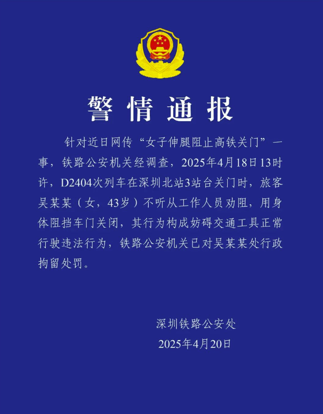 4月18日,一段“女子伸腿阻止高鐵關(guān)門”的視頻在網(wǎng)絡(luò)上引起熱議。視頻中,一名女性旅客強(qiáng)行用身體阻攔車門,兩名工作人員極力制止卻未能成功,直到三名同行人上車才離開車門,隨后列車關(guān)門駛離。4月19日,“@廣鐵集團(tuán)深圳北火車站”發(fā)布情況說明,證實網(wǎng)傳視頻屬實,并稱未造成列車晚點,相關(guān)部門已介入調(diào)查。輿論要求嚴(yán)懲行為人呼聲較高,部分網(wǎng)民不滿工作人員制止不力,對相關(guān)法律規(guī)章制度未嚴(yán)格執(zhí)行。4月20日,深圳鐵路公安處官方微博通報稱,旅客吳某某行為構(gòu)成妨礙交通工具正常行駛違法行為,已被行政拘留。主流輿論點贊警方處置及時,并圍繞“攔門事件何時休”展開討論。如中國網(wǎng)發(fā)文建議,修訂《鐵路安全管理條例》,明確阻礙發(fā)車的量化處罰標(biāo)準(zhǔn),如按延誤時長階梯式罰款。上觀新聞、紅網(wǎng)發(fā)文稱,鐵路部門應(yīng)加大處罰力度,將“危害安全行為”納入個人征信系統(tǒng)、列入限行“黑名單”,形成更強(qiáng)的震懾效應(yīng)。