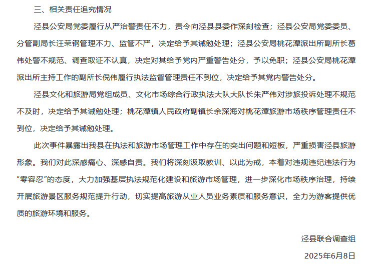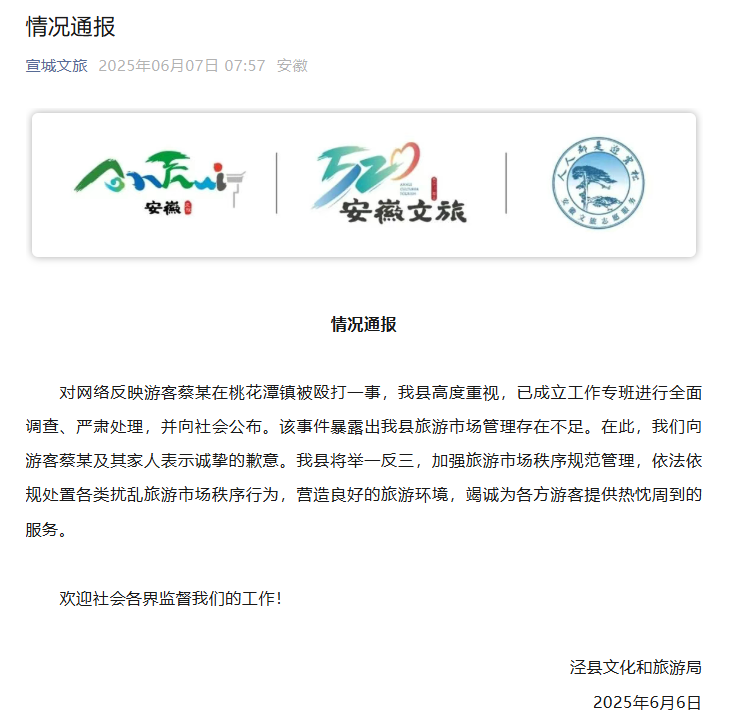 6月7日0時許,涇縣文化和旅游局發(fā)布情況通報(bào)稱,已成立工作專班進(jìn)行全面調(diào)查,向游客蔡某及其家人致歉。但輿論怒火并未完全平息,不少網(wǎng)民表示不能僅讓文旅部門“背鍋”,當(dāng)?shù)毓矙C(jī)關(guān)應(yīng)深入調(diào)查、嚴(yán)肅問責(zé)。據(jù)微信公眾號“涇縣人民政府發(fā)布”7日晚消息,涇縣召開全縣旅游市場秩序整治工作會議,會議要求“聚焦短板弱項(xiàng),抓好旅游市場秩序整治”等。