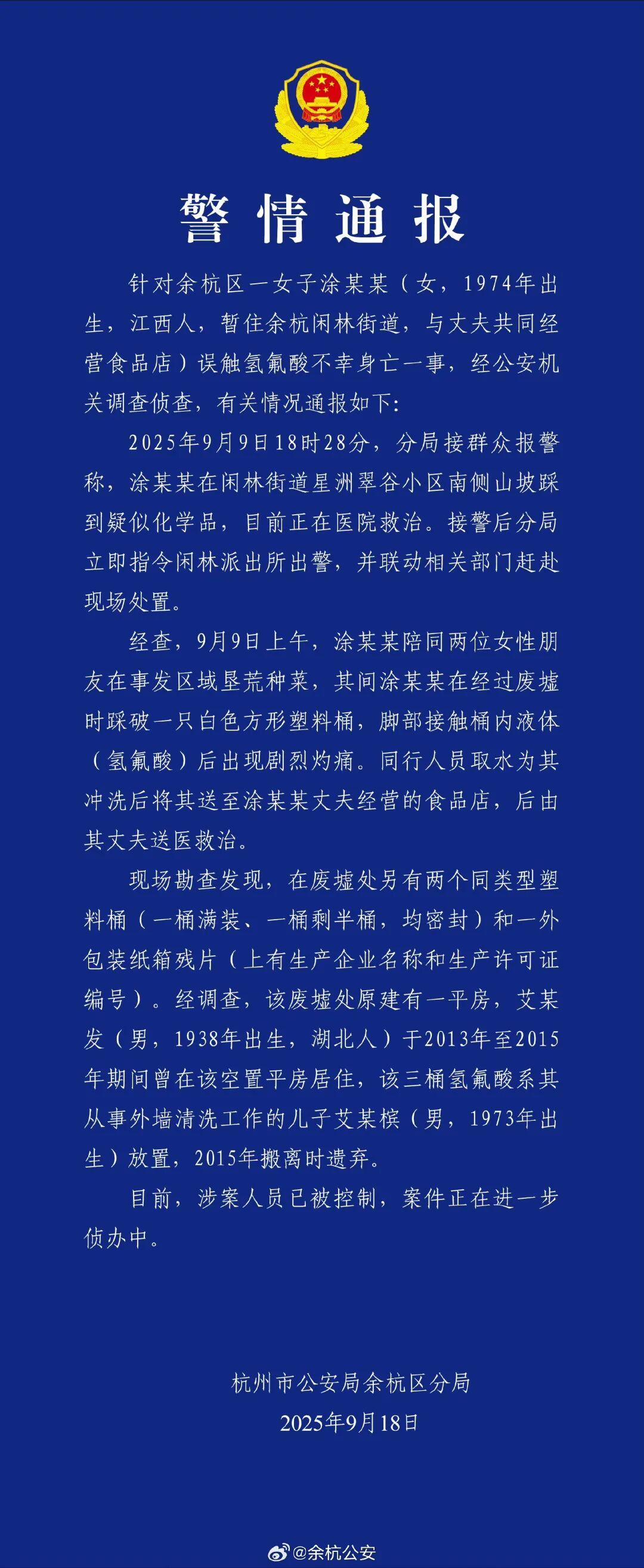 9月18日16時許,“@余杭公安”官方微博發(fā)布警情通報。經(jīng)查,9月9日上午,涂某某陪同兩位女性朋友在事發(fā)區(qū)域墾荒種菜,其間涂某某在經(jīng)過廢墟時踩破一只白色方形塑料桶,腳部接觸桶內(nèi)液體(氫氟酸)后出現(xiàn)劇烈灼痛。同行人員取水為其沖洗后將其送至涂某某丈夫經(jīng)營的食品店,后由其丈夫送醫(yī)救治?,F(xiàn)場勘查發(fā)現(xiàn),在廢墟處另有兩個同類型塑料桶(一桶滿裝、一桶剩半桶,均密封)和一外包裝紙箱殘片(上有生產(chǎn)企業(yè)名稱和生產(chǎn)許可證編號)。經(jīng)調(diào)查,該廢墟處原建有一平房,艾某發(fā)(男,1938年出生,湖北人)于2013年至2015年期間曾在該空置平房居住,該三桶氫氟酸系其從事外墻清洗工作的兒子艾某檳(男,1973年出生)放置,2015年搬離時遺棄。目前,涉案人員已被控制,案件正在進一步偵辦中。