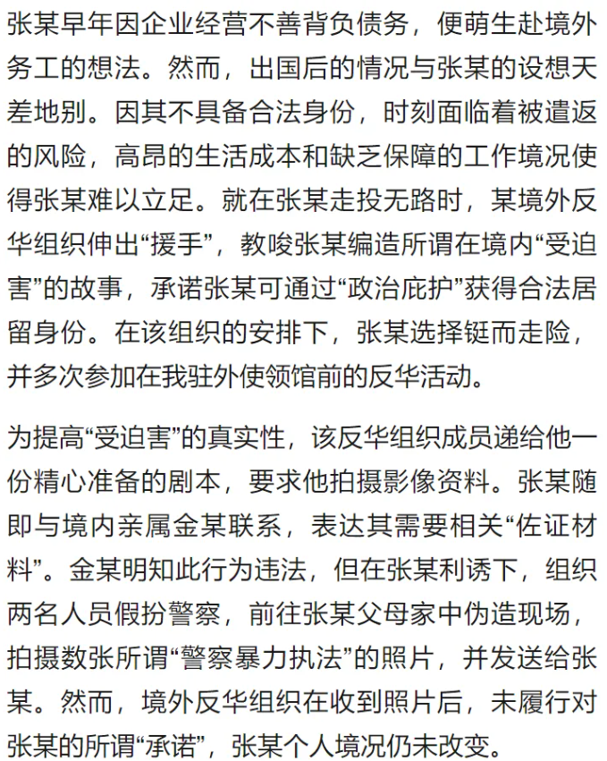4. “境外反華組織教唆擺拍暴力執(zhí)法” 案。8月14日,國家安全部公布一起標題為《跨境賣慘終成空》的案例。據(jù)悉,張某國內企業(yè)經(jīng)營不善負債,赴境外務工后因無合法身份面臨遣返風險。境外反華組織以“政治庇護換取居留身份”為誘餌,提供詳細拍攝劇本,還提出“畫面暴力血腥”“效果要慘”“抓拍增強真實感”等要求。在反華組織教唆下,張某聯(lián)系到親屬金某,金某明知此行為違法,但在張某利誘下組織兩名人員假扮警察,前往張某父母家中偽造現(xiàn)場,拍攝數(shù)張所謂“警察暴力執(zhí)法”的照片,并將材料發(fā)送境外,但境外反華組織在收到照片后未履行對張某的所謂“承諾”。該案最終被國家安全機關破獲。央視網(wǎng)、微信公眾號“俠客島”等轉發(fā)相關內容。輿論將此案稱為一場“政治避難”鬧劇,指出“因一己之利參加境外反華活動,為反華勢力提供煽宣‘彈藥’,但最終竹籃打水一場空”。