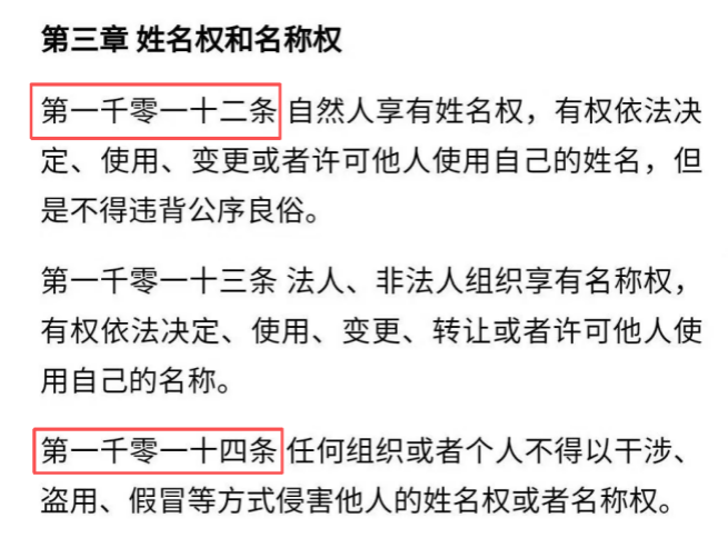 《中華人民共和國(guó)民法典》第一千零一十二條、第一千零一十四條規(guī)定,自然人享有姓名權(quán),有權(quán)依法決定、使用、變更或者許可他人使用自己的姓名,但是不得違背公序良俗。任何組織或者個(gè)人不得以干涉、盜用、假冒等方式侵害他人的姓名權(quán)或者名稱(chēng)權(quán)。