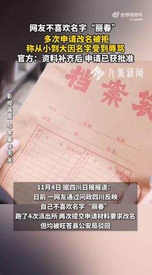 11月5日,據(jù)四川日?qǐng)?bào)微信公眾號(hào)報(bào)道,四川省廣元市旺蒼縣一位居民通過(guò)“四川省網(wǎng)上群眾工作平臺(tái)——問(wèn)政四川”反映,自己不喜歡名字“麗春”,跑了四次派出所,兩次提交申請(qǐng)材料要求改名,但均被旺蒼縣公安局駁回。該網(wǎng)民訴苦說(shuō),自己從小到大因這個(gè)名字受到不少他人辱罵,造成了精神和心理傷害。