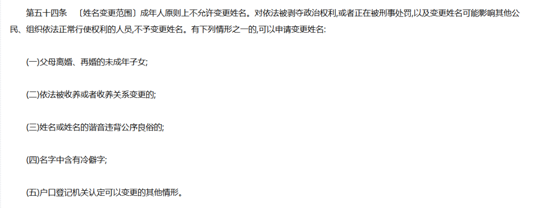 四川省曾經(jīng)出臺(tái)了《全省公安機(jī)關(guān)戶(hù)政管理工作規(guī)程(試行)》。其中,第五十四條規(guī)定,成年人原則上不允許變更姓名。有下列情形之一的,可以申請(qǐng)變更姓名:(一)父母離婚、再婚的未成年子女;(二)依法被收養(yǎng)或者收養(yǎng)關(guān)系變更的;(三)姓名或姓名的諧音違背公序良俗的;(四)名字中含有冷僻字;(五)戶(hù)口登記機(jī)關(guān)認(rèn)定可以變更的其他情形。