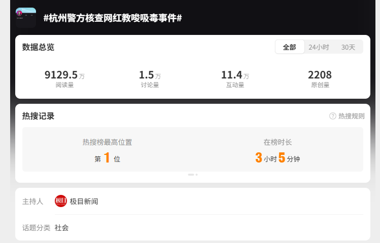 截至11月9日20時,相關信息量2.5萬余條,微博話題“#杭州警方核查網(wǎng)紅教唆吸毒事件#”“#800萬粉絲網(wǎng)紅被控訴教唆他人吸毒#”“#被控教唆吸毒800萬粉絲網(wǎng)紅被封號#”等閱讀量累計超1.5億。