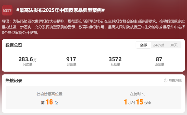 截至11月21日14時,全網(wǎng)相關(guān)信息1.1萬余條。“#最高法發(fā)布2025年中國反家暴典型案例#”“#自殘威脅也是家庭暴力#”等微博話題閱讀量累計超5201.3萬。
