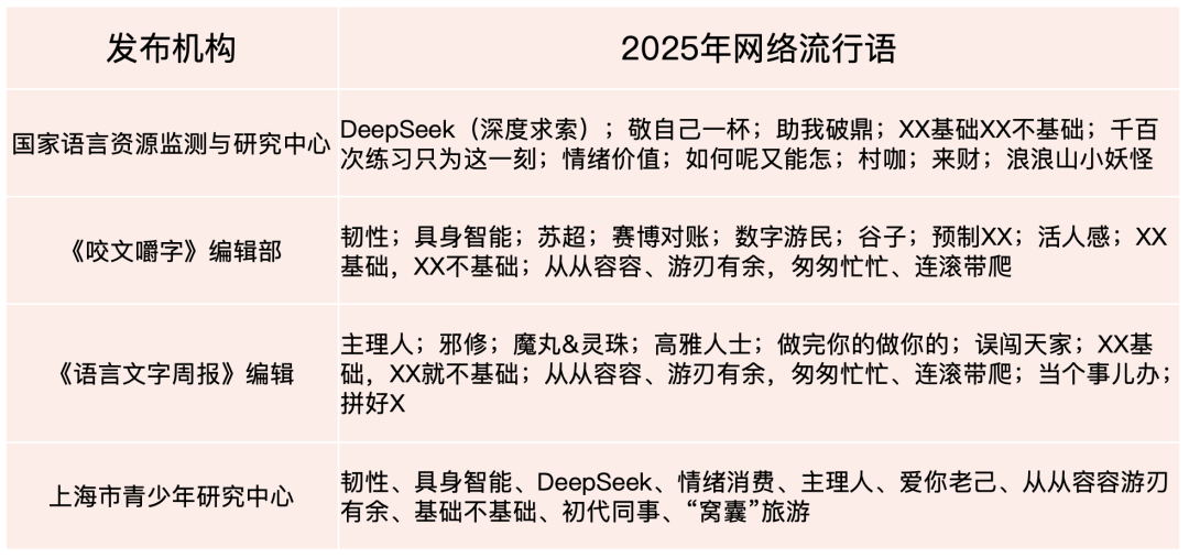 2025年12月,國家語言資源監(jiān)測與研究中心、《咬文嚼字》編輯部及《語言文字周報》編輯部相繼發(fā)布年度網(wǎng)絡(luò)流行語榜單。12月25日,上海市青少年研究中心立足青年群體視角,推出了“2025年度青年十大熱詞”。這些入選的流行語涵蓋科技、文化、消費等多個領(lǐng)域,其中“韌性”“DeepSeek”“具身智能”“從從容容游刃有余”等詞匯更是出現(xiàn)在不同機構(gòu)的榜單上,呈現(xiàn)出高度重合性。它們不僅構(gòu)成了一部由全民共同書寫的“情緒備忘錄”,也折射出當(dāng)前傳播格局的演變與社會價值觀念的變遷。法治網(wǎng)輿情中心從使用主體、社會心態(tài)、傳播邏輯、行為趨向四個維度,對2025年網(wǎng)絡(luò)流行語展開深入解讀。