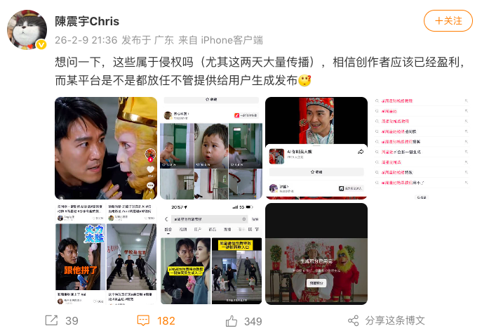 2月9日,周星馳經(jīng)紀(jì)人“@陳震宇Chris”發(fā)現(xiàn)近期某短視頻平臺上AI生成的周星馳經(jīng)典電影片段被大量傳播,并在微博上發(fā)問:“這些屬于侵權(quán)嗎?創(chuàng)作者可能已經(jīng)借此盈利,平臺是否放任不管?”相關(guān)言論迅速在網(wǎng)絡(luò)引發(fā)熱議,將“AI魔改”視頻再次推上輿論風(fēng)口浪尖。