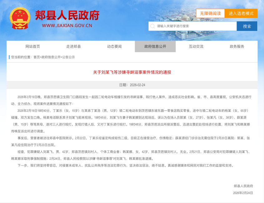 2月24日,平頂山市郟縣人民政府跟進(jìn)發(fā)布詳細(xì)通報(bào),稱劉某飛與妻子韓某娜到達(dá)現(xiàn)場后,誤認(rèn)為在場人員郭某、張某凡、薛某源辱罵其母,遂對三人進(jìn)行毆打。發(fā)現(xiàn)打錯人后,又對丁某樂進(jìn)行毆打。通報(bào)確認(rèn)被打女孩丁某樂傷情鑒定為輕傷二級,目前正在接受治療,三名勸架路人經(jīng)診治均已離院。經(jīng)查,犯罪嫌疑人劉某飛,男,42歲,郟縣茨芭鎮(zhèn)劉村人,個體工商業(yè)者;韓某娜,女,42歲,郟縣茨芭鎮(zhèn)劉村人,無業(yè)。24日,郟縣人民檢察院以涉嫌尋釁滋事罪對劉某飛、韓某娜批準(zhǔn)逮捕。