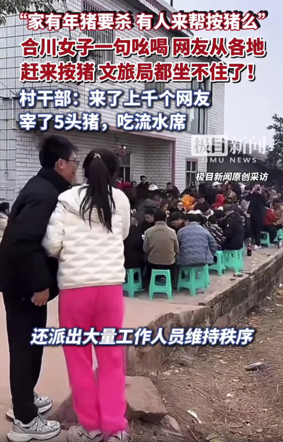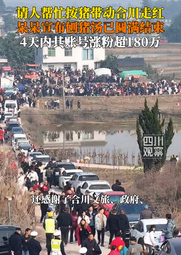 1月9日凌晨,來自重慶合川的抖音博主“呆呆”發(fā)視頻稱,1月11日家中要殺兩頭豬,因為父母年齡大了按不住,希望有人幫忙按豬,將請吃刨豬湯答謝,“呆呆”還開玩笑稱“就想家門口停滿車,在村里揚眉吐氣一回”。短短兩日,視頻點贊量突破18萬,轉(zhuǎn)發(fā)量超14萬,“呆呆”建立的6個500人的“刨豬湯”群很快滿員。盡管“呆呆”連夜采購食材并報備派出所,但已無法阻止網(wǎng)民熱情。1月10日凌晨,合川文旅緊急抽調(diào)工作人員趕赴現(xiàn)場,協(xié)助保障活動順利進(jìn)行。1月11日,來自全國各地超4000名網(wǎng)民匯聚“呆呆”家鄉(xiāng),其中不乏“鹵鵝哥”等知名網(wǎng)紅。1月11日至12日,“呆呆”連開多場直播,邀請網(wǎng)民參加家鄉(xiāng)大聯(lián)歡,直播間觀看和點贊人數(shù)均超3000萬人次。在合川文旅、愛心企業(yè)、網(wǎng)民等多方贊助下,原計劃的兩頭豬增至五頭,現(xiàn)場設(shè)五個分會場分散人流,公安部門疏導(dǎo)交通。合川文旅部門帶著本地特產(chǎn)、景區(qū)門票到現(xiàn)場,講解“刨豬宴”和合川歷史文化,還設(shè)置篝火、煙花、舞龍等環(huán)節(jié)。據(jù)現(xiàn)場網(wǎng)民透露,當(dāng)?shù)匾还矓[了300桌宴席,最多時同時有超3000人。該事件引發(fā)熱烈討論,“殺豬女孩呆呆一天漲粉150萬”“呆呆殺豬宴一天蒸1000多斤大米”等多個話題沖上社交平臺熱搜。