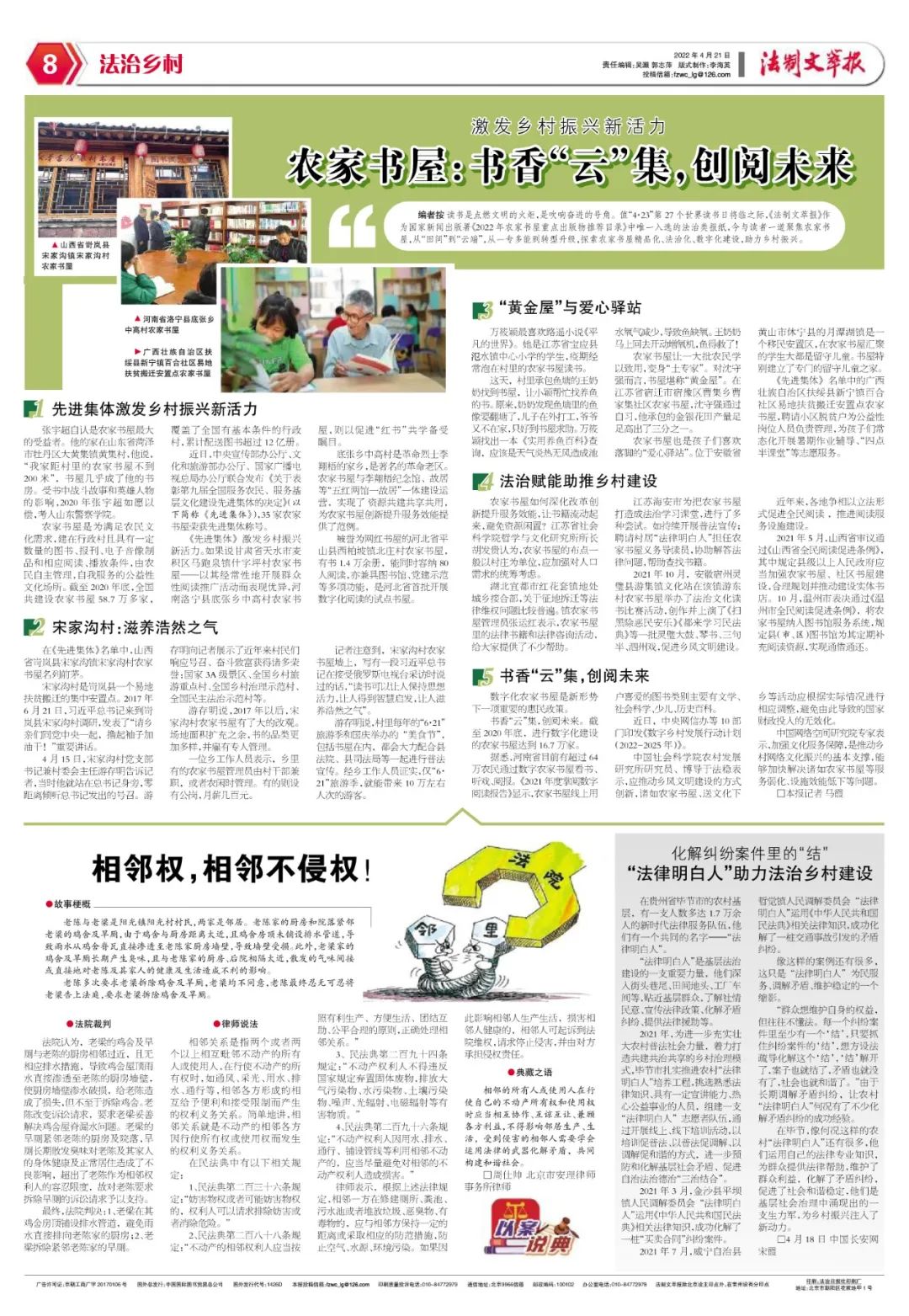 讀書是點燃文明的火炬,是吹響奮進(jìn)的號角。值“4·23”第27個世界讀書日將臨之際,《法制文萃報》作為國家新聞出版署《2022年農(nóng)家書屋重點出版物推薦目錄》中唯一入選的法治類報紙,今與讀者一道聚焦農(nóng)家書屋,從“田間”到“云端”,從一專多能到轉(zhuǎn)型升級,探索農(nóng)家書屋精品化、法治化、數(shù)字化建設(shè),助力鄉(xiāng)村振興。