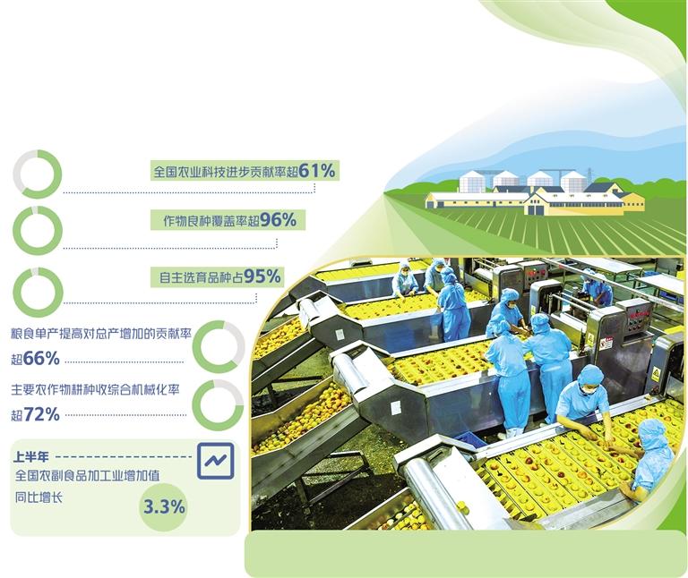 “農(nóng)業(yè)不加工,到頭一場空”。過去,受制于加工技術(shù),農(nóng)產(chǎn)品加工普遍同質(zhì)化,精深加工不足,加工轉(zhuǎn)化率低。中國農(nóng)科院農(nóng)產(chǎn)品加工研究所所長王鳳忠說,針對加工的科技短板,全國300多家龍頭企業(yè)和科研機構(gòu)成立了國家農(nóng)產(chǎn)品加工產(chǎn)業(yè)科技創(chuàng)新聯(lián)盟。數(shù)據(jù)顯示,截至目前,我國已經(jīng)建立農(nóng)產(chǎn)品綠色加工技術(shù)體系,開發(fā)形成了4大類、22個中類、57個小類共計數(shù)萬種食品。加工技術(shù)在全程冷鏈、精深加工、營養(yǎng)健康等領(lǐng)域快速發(fā)展,推動了農(nóng)產(chǎn)品加工業(yè)質(zhì)量提升。上半年,全國農(nóng)副食品加工業(yè)增加值同比增長3.3%。