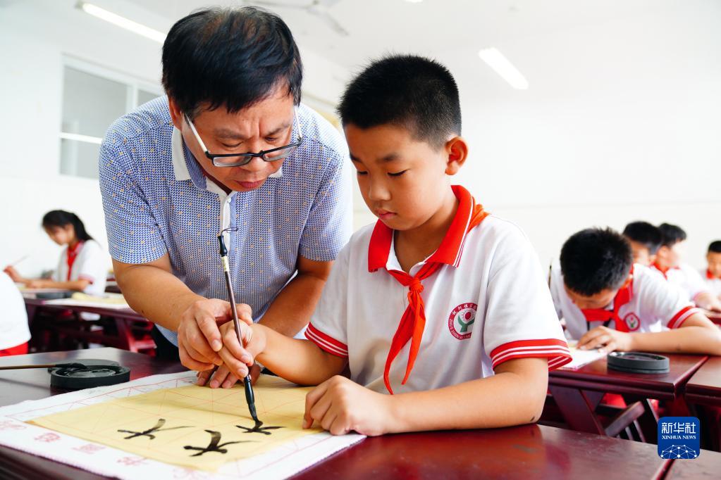 7月28日,在山東省齊河縣祝阿鎮(zhèn)馬坊社區(qū)鄉(xiāng)村“復興少年宮”,田偉在教小朋友練習書法。