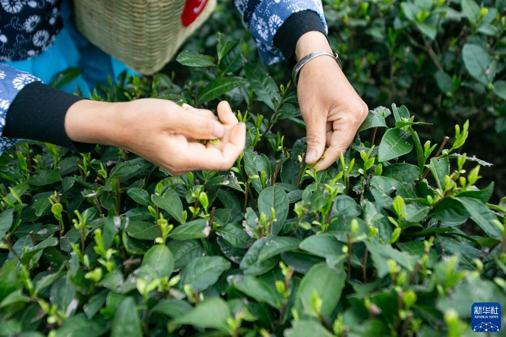 3月22日,在重慶市永川區(qū)永榮鎮(zhèn)鄉(xiāng)村振興就業(yè)園,采茶工在采摘茶葉。記者 儲加音 攝