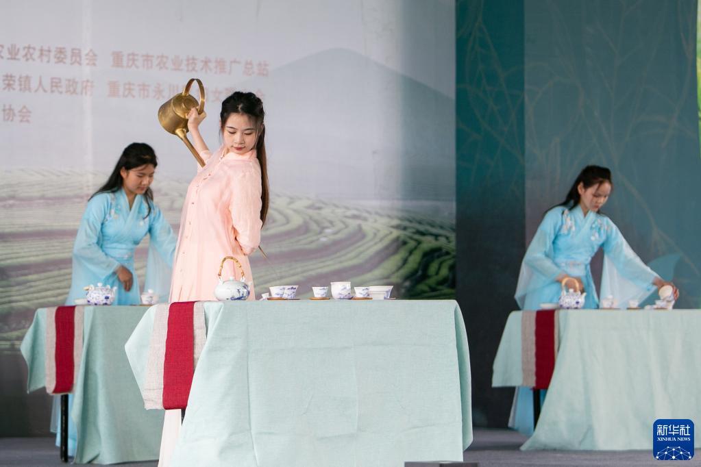 3月22日,在重慶市永川區(qū)永榮鎮(zhèn)鄉(xiāng)村振興就業(yè)園,演藝人員在表演茶藝。記者 儲加音 攝