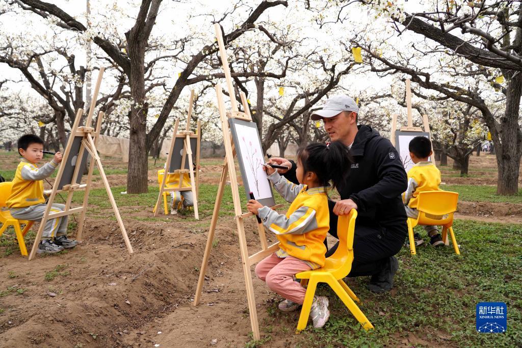 4月2日,老師指導(dǎo)小朋友在臨城縣北程村百年梨園寫(xiě)生。記者 駱學(xué)峰 攝