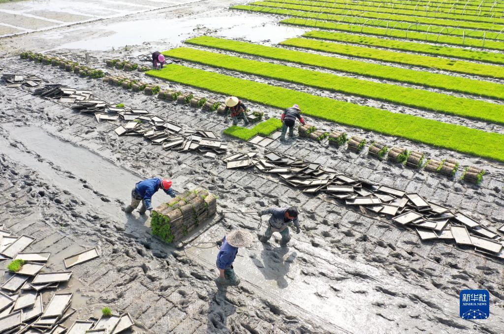 4月16日,浙江省樂清市城東街道農(nóng)民在搬運秧苗(無人機照片)。蔡寬元 攝