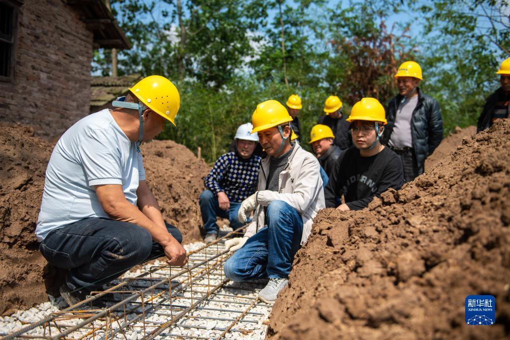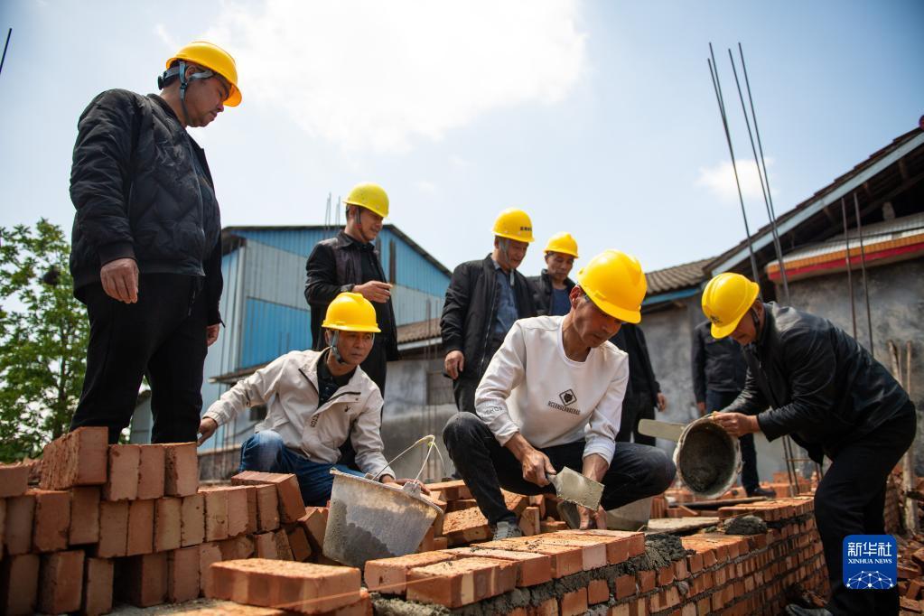4月25日,在大鯨港鎮(zhèn)五合剅社區(qū),工人在實(shí)操砌墻。記者 陳思汗 攝