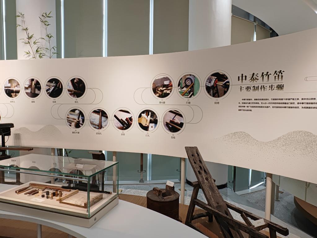 紫荊村擁有2.8萬(wàn)畝苦竹林,年產(chǎn)苦竹1.6萬(wàn)噸,年產(chǎn)竹笛300萬(wàn)支,是國(guó)內(nèi)著名的“竹笛之鄉(xiāng)”。2020年底,中泰街道和紫荊村將以前的竹器廠進(jìn)行改造,建起了這座以笛文化為主題的鄉(xiāng)村博物館。從空中向下望去,博物館就如同鑲嵌在村居竹林間的一個(gè)音符。村黨委書記鮑明遠(yuǎn)告訴記者,以展示館為中心,村里還建起了竹笛主題沉浸式音樂廣場(chǎng)和竹笛非遺工坊,推動(dòng)文旅融合,更好地展示笛文化。