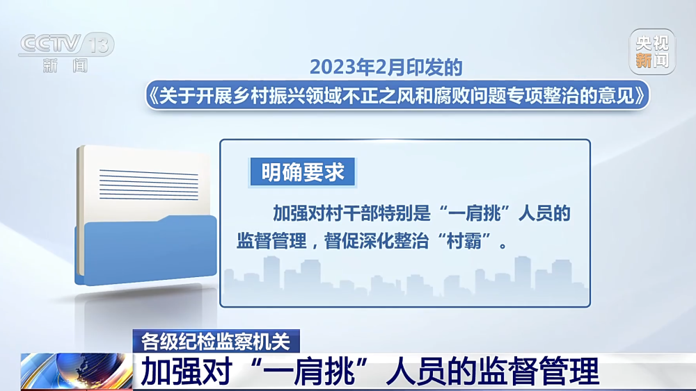 今年2月印發(fā)的《關(guān)于開(kāi)展鄉(xiāng)村振興領(lǐng)域不正之風(fēng)和腐敗問(wèn)題專項(xiàng)整治的意見(jiàn)》就明確要求,加強(qiáng)對(duì)村干部特別是“一肩挑”人員的監(jiān)督管理,督促深化整治“村霸”。