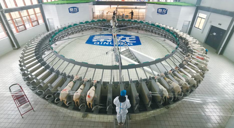 當(dāng)日9時(shí),到了給奶山羊擠奶時(shí)間,羊群通過(guò)單向趕羊通道有序進(jìn)入百位轉(zhuǎn)盤式智能擠奶設(shè)備完成每日的產(chǎn)奶任務(wù)?!拔覀兪褂玫陌傥晦D(zhuǎn)盤式智能擠奶設(shè)備,實(shí)現(xiàn)了每100只羊從清洗到完成擠奶僅需10分鐘,擠奶效率大幅提升?!庇谇邎@說(shuō)。