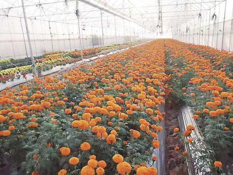 在農安縣三盛玉鎮(zhèn)三盛玉村的花卉大棚內,滿是準備移栽的萬壽菊(資料圖片)